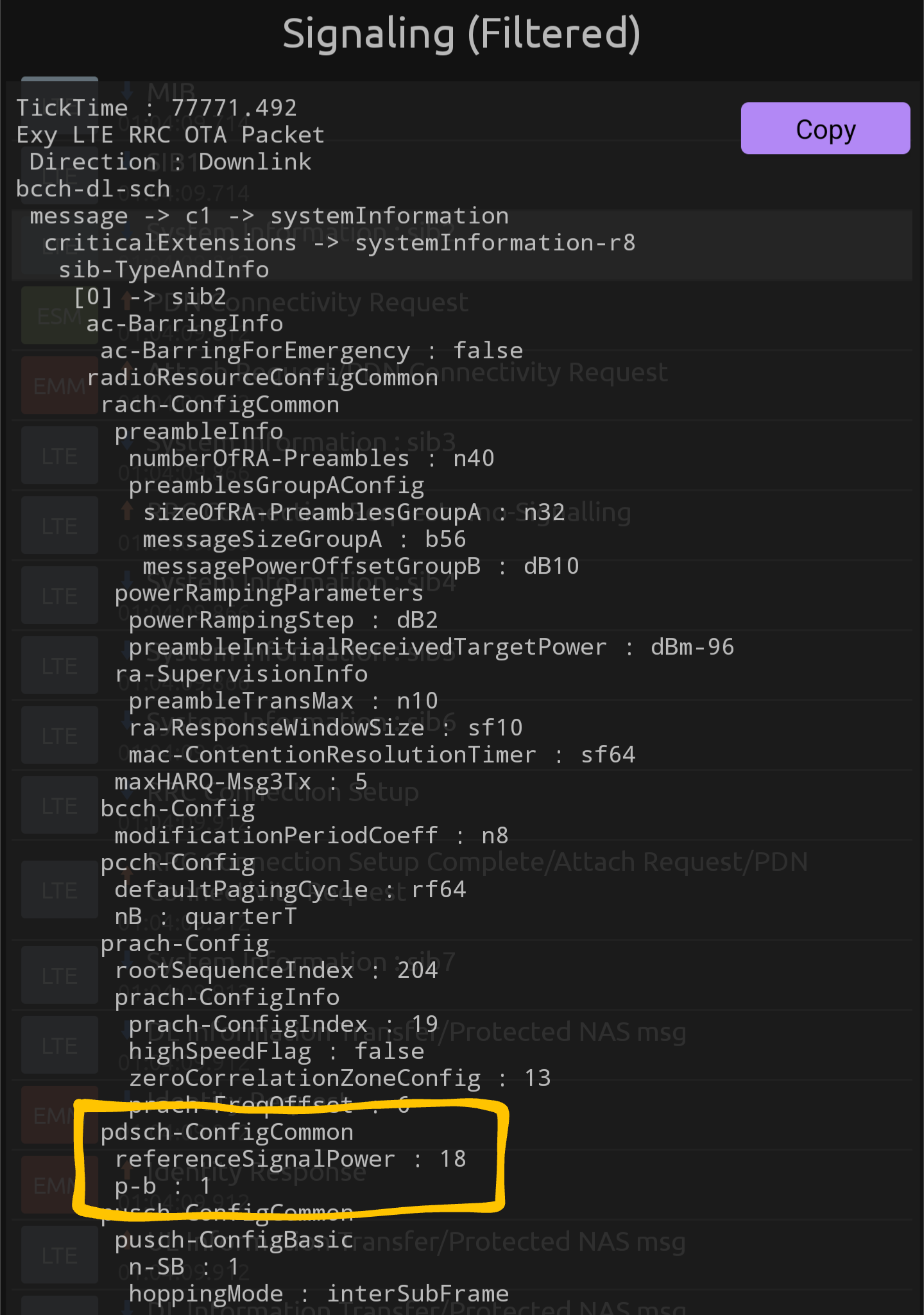 Both RSP and p-b can be found within a network's LTE SIB2, as seen below in a screenshot of Network Signal Guru: